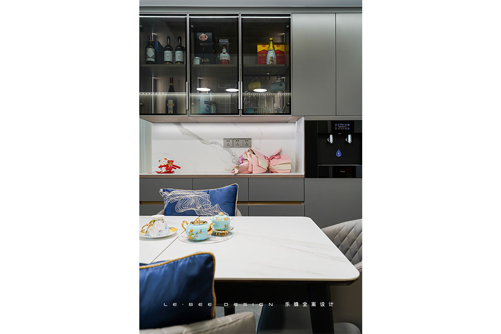 一桌一柜,成就餐廳最簡潔也最豐富的功能布局,簡潔在外,豐富在內(nèi)。整面墻的柜體設(shè)計,結(jié)合水吧,輕松儲物,動線便捷。右側(cè)高柜嵌入直飲機(jī),平時家人飲水不必進(jìn)入廚房,在此地就可暢飲。