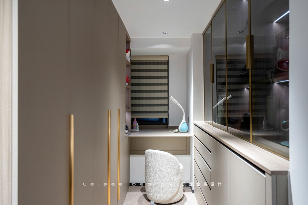 主臥經(jīng)過重新規(guī)劃后的衣帽間擁有足夠的空間進(jìn)行單獨(dú)設(shè)置。一側(cè)是整墻的衣柜,全家人的衣物都能收入其中。一側(cè)是矮柜加玻璃展示柜的設(shè)計,矮柜收納首飾和不常用的鞋物,玻璃柜放置包包,內(nèi)嵌燈帶燈光打下,嫣然高級藏品。