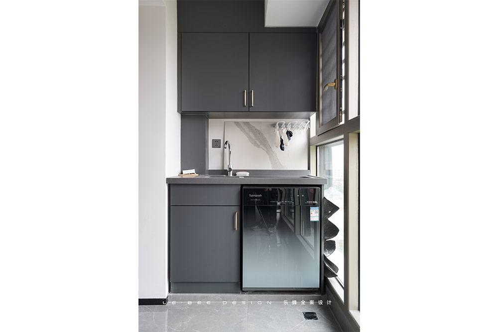 兩組柜體解決了陽臺儲物和洗衣需求,洗衣柜地臺特地做了抬高,為的是不用經(jīng)常打掃洗衣機(jī)下面的污垢,對打掃的工作量做了很大的削減,哪怕只是幾厘米也是人性化的體現(xiàn),洗衣機(jī)內(nèi)嵌柜體,釋放陽臺空間。