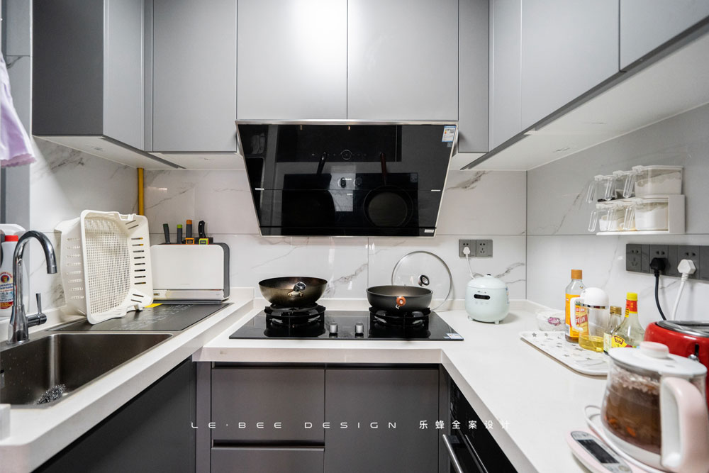 U字型廚房臺面空間利用最大化,高低臺的設(shè)計符合人體工程學(xué),廚房操作時既不會累手也不會累腰。