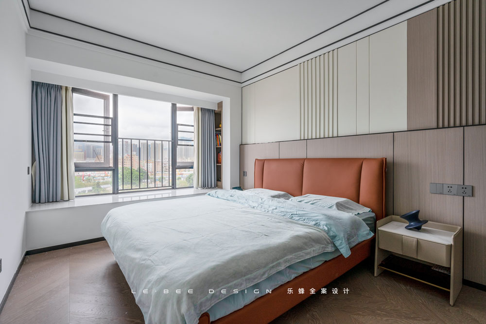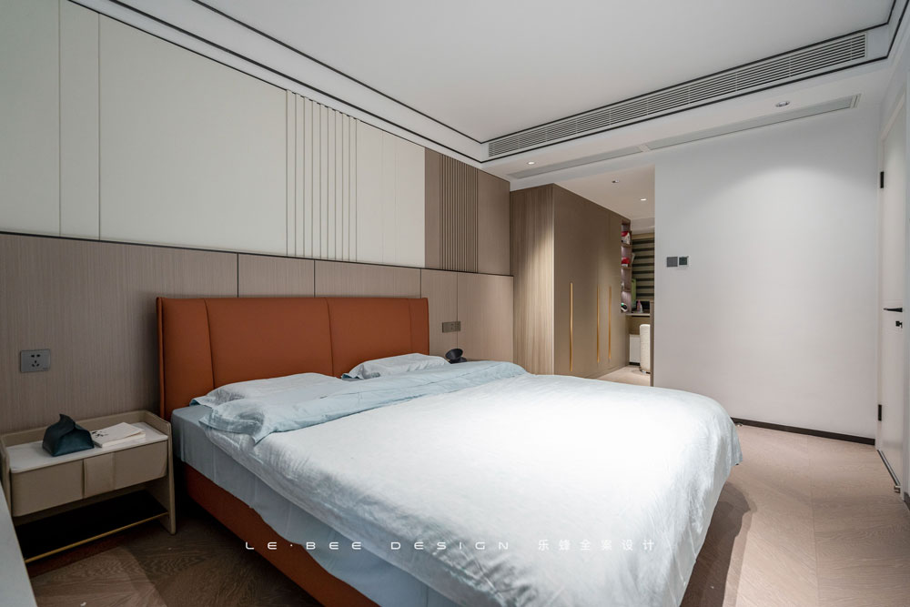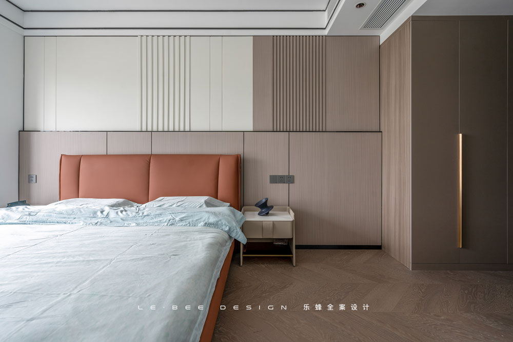 主臥有自己的風(fēng)格,拋棄了高冷的灰色系,選擇了更為溫馨的咖色原木系。臥室背景運(yùn)用護(hù)墻板做了墻裙設(shè)計,奶白色和咖色的不規(guī)則配比,既有亮點(diǎn),又不突兀,十分耐看。