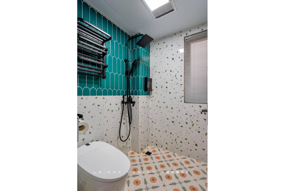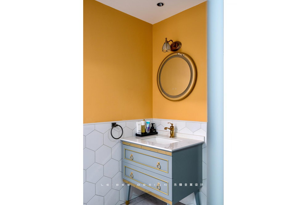 洗手盆外移至過(guò)道處,墻面運(yùn)用六角磚和防水涂料,蛋黃色和莫蘭迪藍(lán)結(jié)合,打造既復(fù)古又小清新的一角,日常的洗漱也變得有趣起來(lái)。