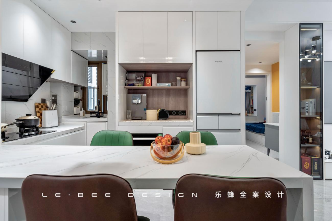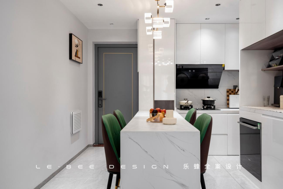 餐廳和廚房一體白色系,潔凈典雅,餐桌以吧臺(tái)的方式取代,多了更多休閑色彩。