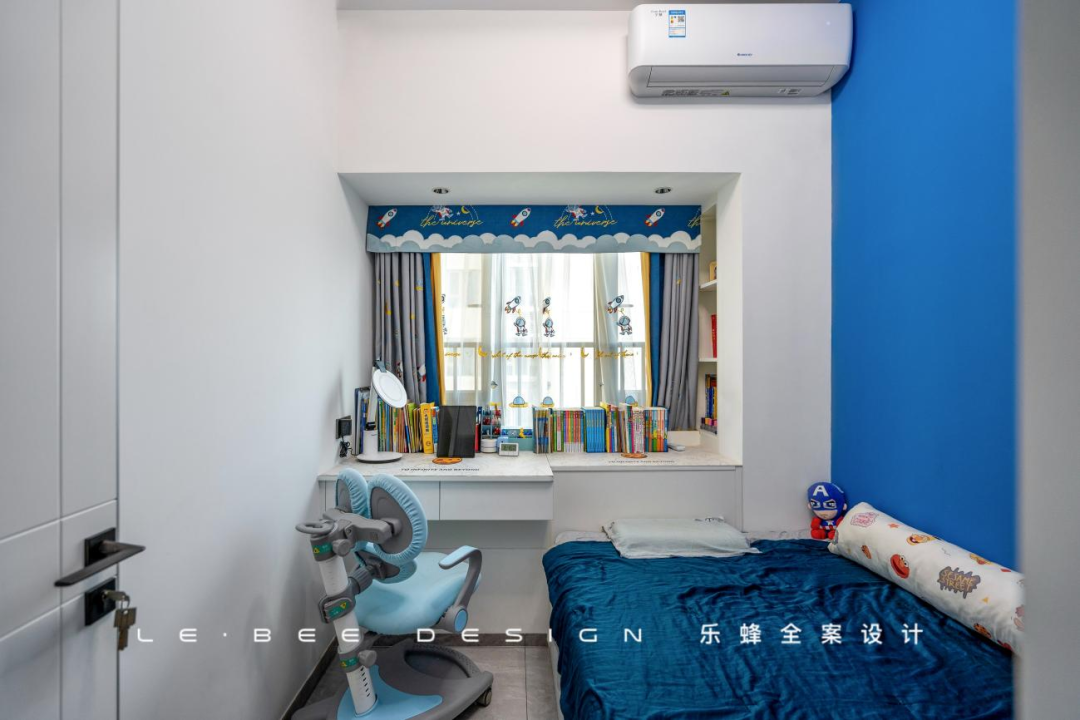 兒童房為小男孩居住的房間,男孩酷愛(ài)藍(lán)色,所以在兒童房中采取了大量的藍(lán)色。床邊背景選擇克萊因藍(lán),亮眼之余還頗具時(shí)尚感。