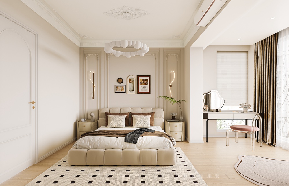 主臥采用超大落地窗設計,讓室內充滿自然光線。一側的簡約黑白梳妝桌椅和另一側的簡約電腦桌,都體現了主人的精致品味。床的色彩搭配也非常得體,白、棕、杏色的法式衣柜和單色簡約床套讓整個空間更顯優(yōu)雅大氣。