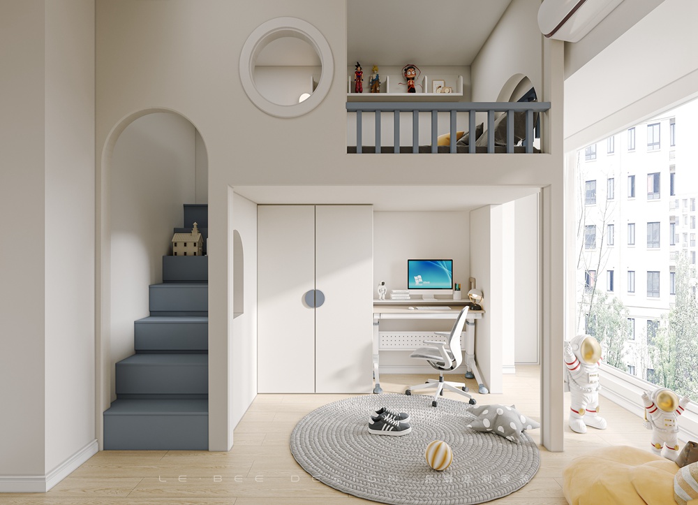 三間兒童房各具特色。第一間兒童房是小男孩的房間,采用復式風格設計,讓房間更加富有趣味性和創(chuàng)意。同時整個房間的裝修也符合兒童喜歡的活潑可愛風格,讓孩子們在這里玩耍、學習更加愉快。