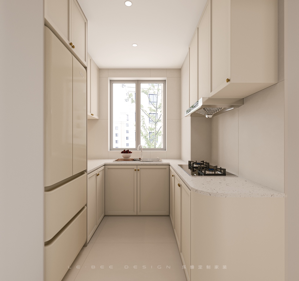 簡約色系統(tǒng)一,回字型設計,廚房設計的收納空間超級足,還配有雙開的大冰箱,放食材放水果都超夠空間。
