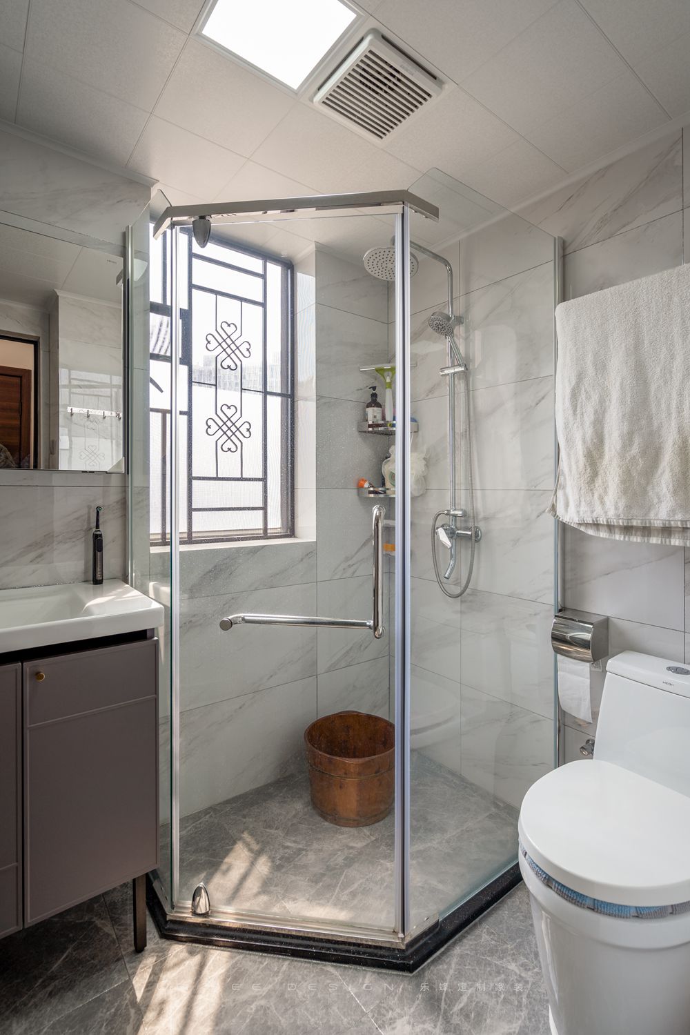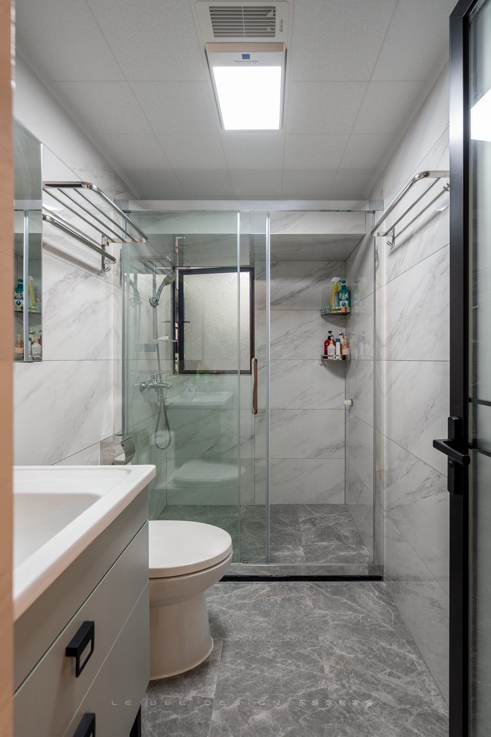 主衛(wèi)的格局為正方形,所以設(shè)計(jì)了鉆石型淋浴房隔絕水汽。洗手臺和馬桶區(qū)分隔兩側(cè),功能區(qū)分工明確??托l(wèi)同樣選擇干濕分離的形式,空間內(nèi)的每一處收納都被利用到了極致。鏡面柜和馬桶上方毛巾架增加了衛(wèi)生間收納容量,一體式臺盆方便臺面的清潔打理,衛(wèi)生間中的每一處都做到了舒心、安心。