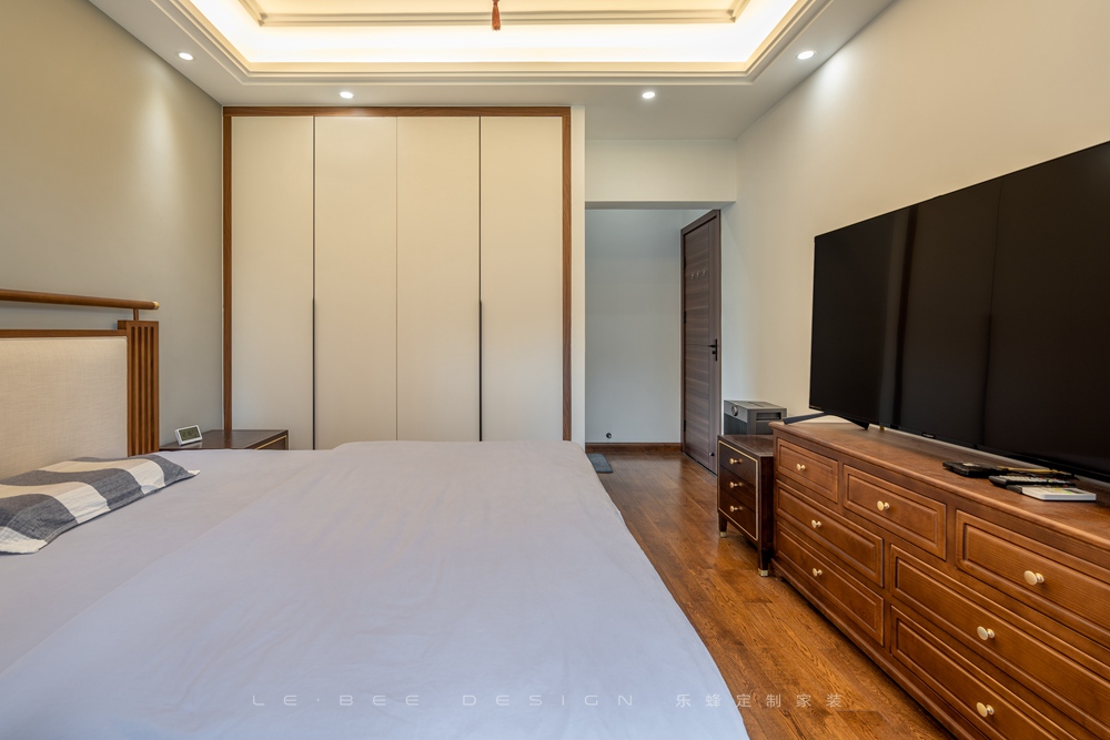 主臥背景選擇了百搭的莫蘭迪色系,營造素雅氛圍。清淡的色彩更容易營造溫馨舒適的空間,主臥色調(diào)深淺搭配得當(dāng),保留了中式的沉穩(wěn),也保留了現(xiàn)代的簡約。床邊靠墻設(shè)計(jì)衣柜,白色極簡面板和隱形把手設(shè)計(jì),利落不張揚(yáng)。床尾放置一組電視柜,增加了主臥內(nèi)部的收納容量。