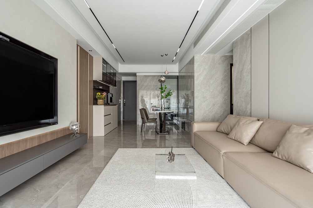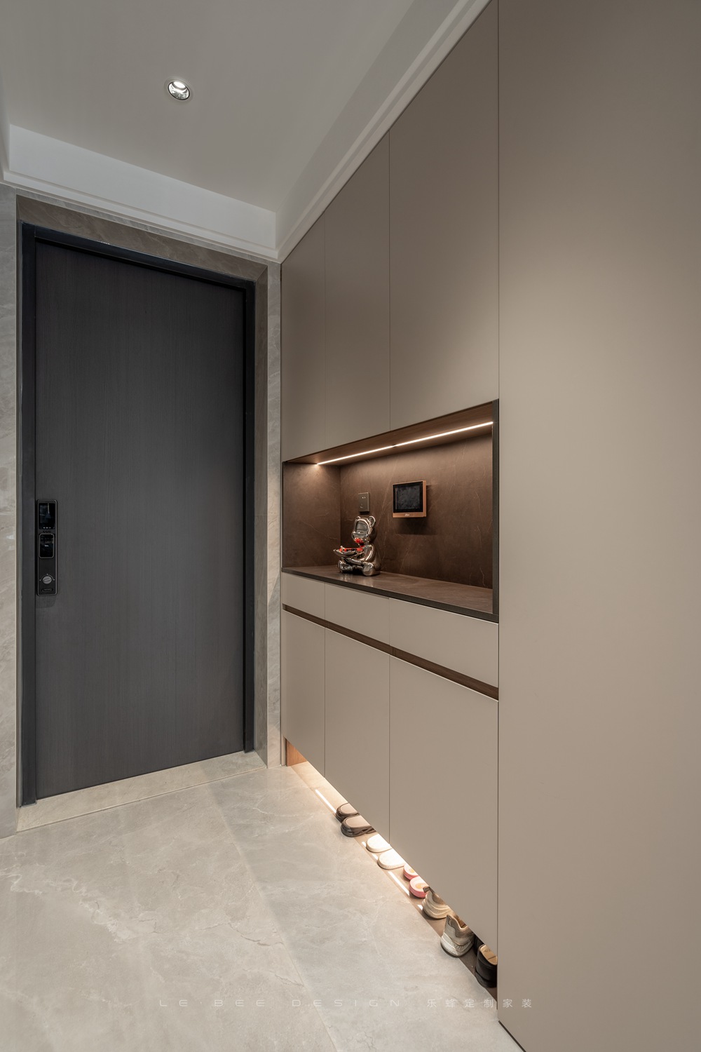 靠墻設(shè)計一組玄關(guān)柜,奶咖色的面板和深棕色結(jié)合,營造溫潤質(zhì)感。玄關(guān)柜利用了極簡的隱形把手設(shè)計,底部做了懸空,方便日常拖鞋和便鞋的換取。
