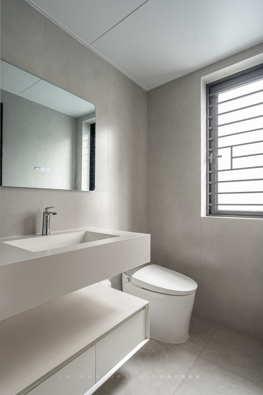 衛(wèi)生間選擇了仿微水泥磚面,洗手臺選擇了巖板材質(zhì)的一體式臺盆,為的是打造一個擁有侘寂風(fēng)的衛(wèi)生間。極簡主義是美感的另一種加持