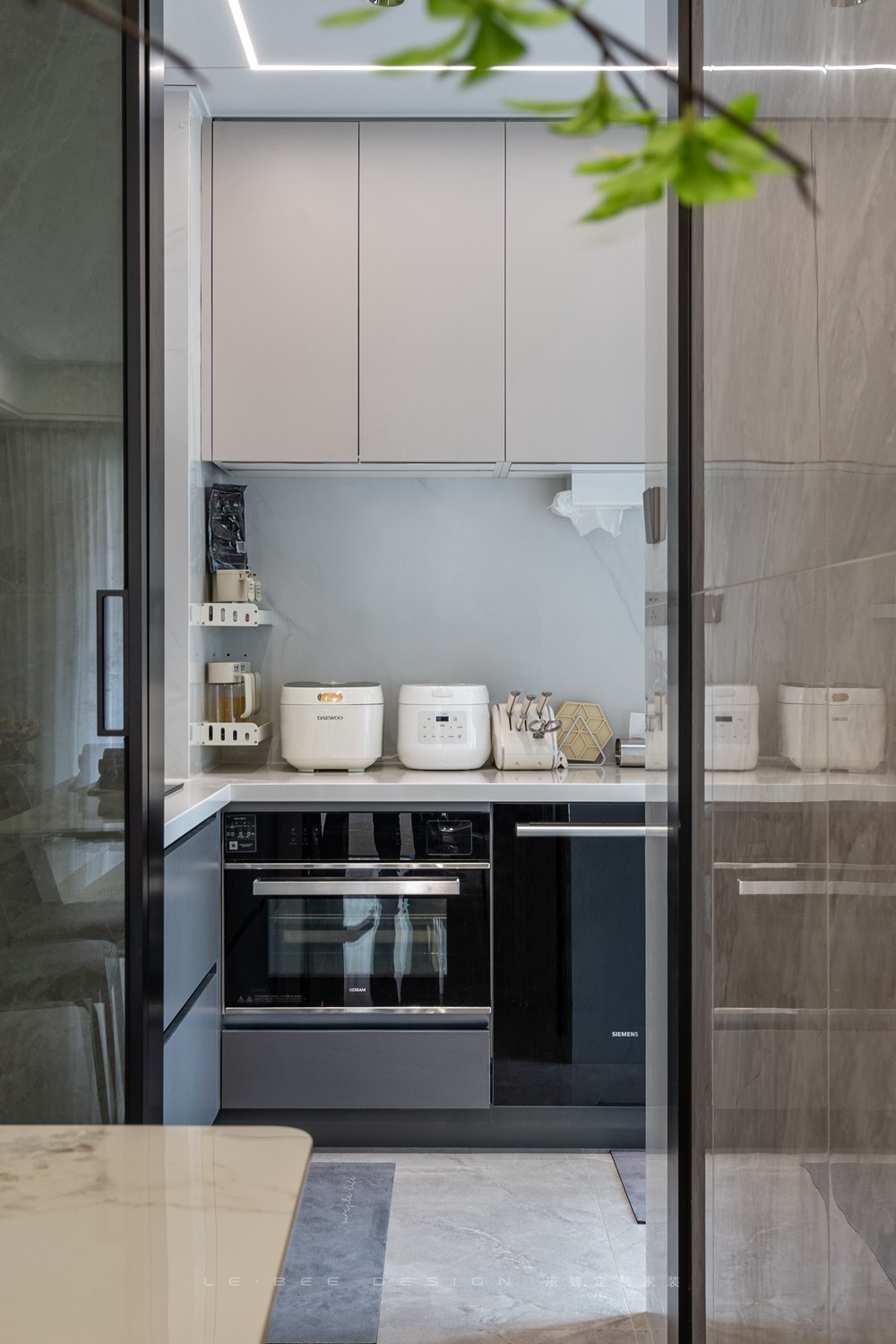 對簡潔有著較高要求的業(yè)主,在廚房的設(shè)計和陳列之中也能窺見一二。廚房的櫥柜和臺面設(shè)計井然有序,科學(xué)的設(shè)計能夠輔助我們將生活打理得井井有條。