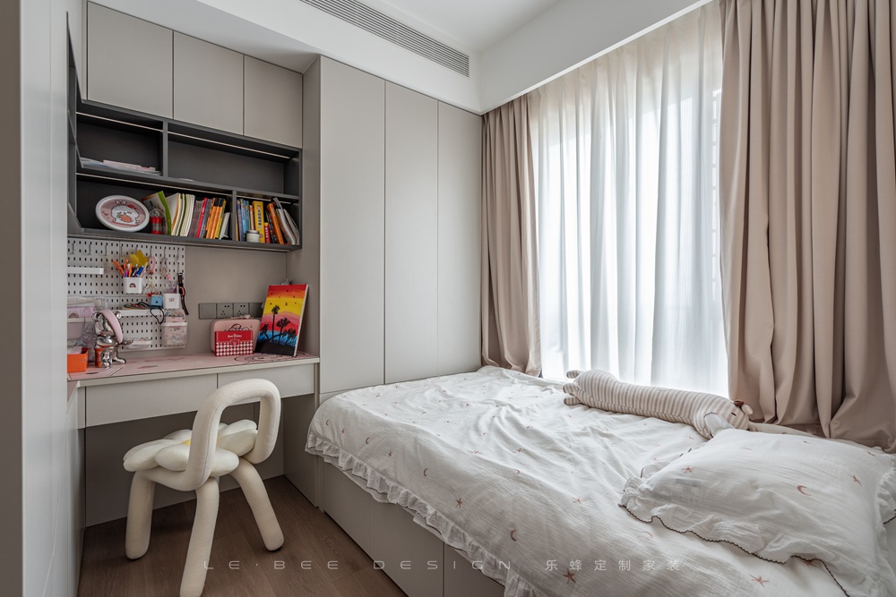 兒童房設(shè)計為榻榻米的形式,將空間內(nèi)的收納和功能最大化。作為女生使用的房間,房間內(nèi)選擇了柔和舒適的莫蘭迪色系,打造溫馨舒適的空間。
