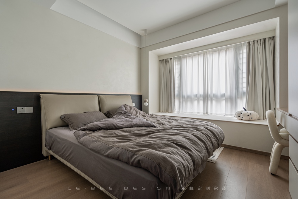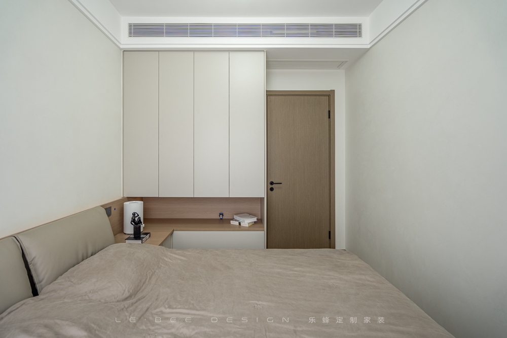 次臥舍棄了傳統(tǒng)的床頭柜,將床頭柜設(shè)計為和衣柜一體的形式,空間的利用更加靈活,既不會影響衣柜的使用,床邊置物空間也得到了增加。