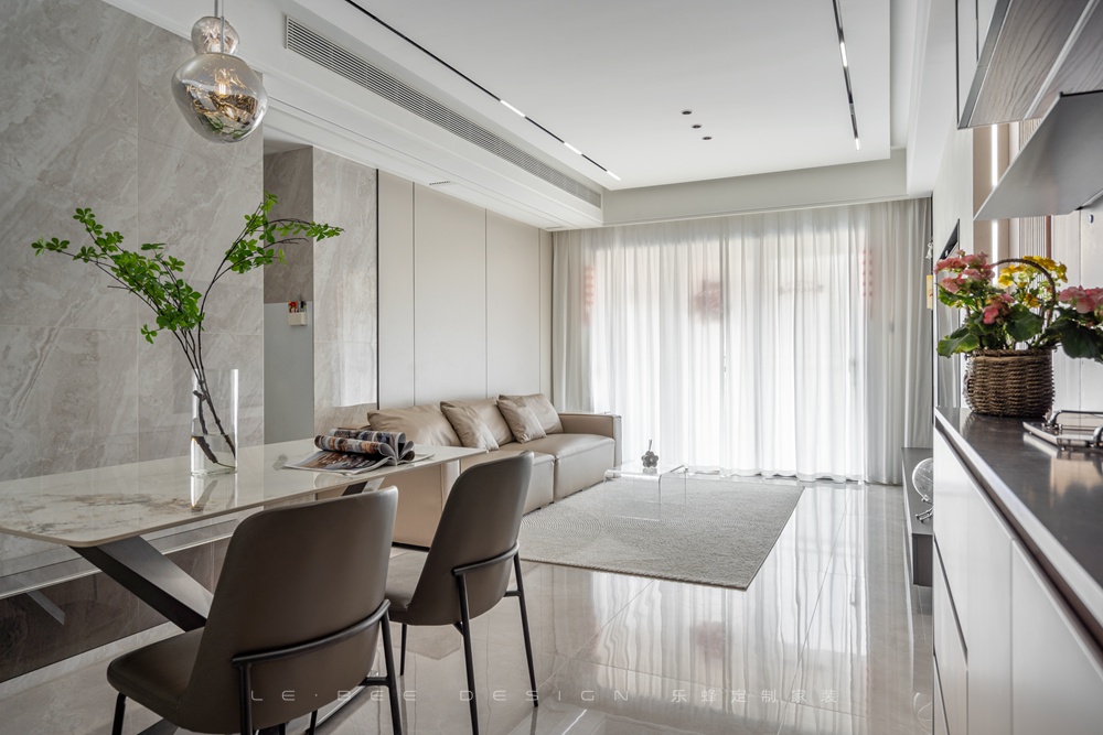 餐廳設(shè)計收納和用餐功能,一邊的餐椅設(shè)計為卡座的形式,采取的同樣是透明亞克力凳,落座便捷,也能減少餐廳空間的占用。