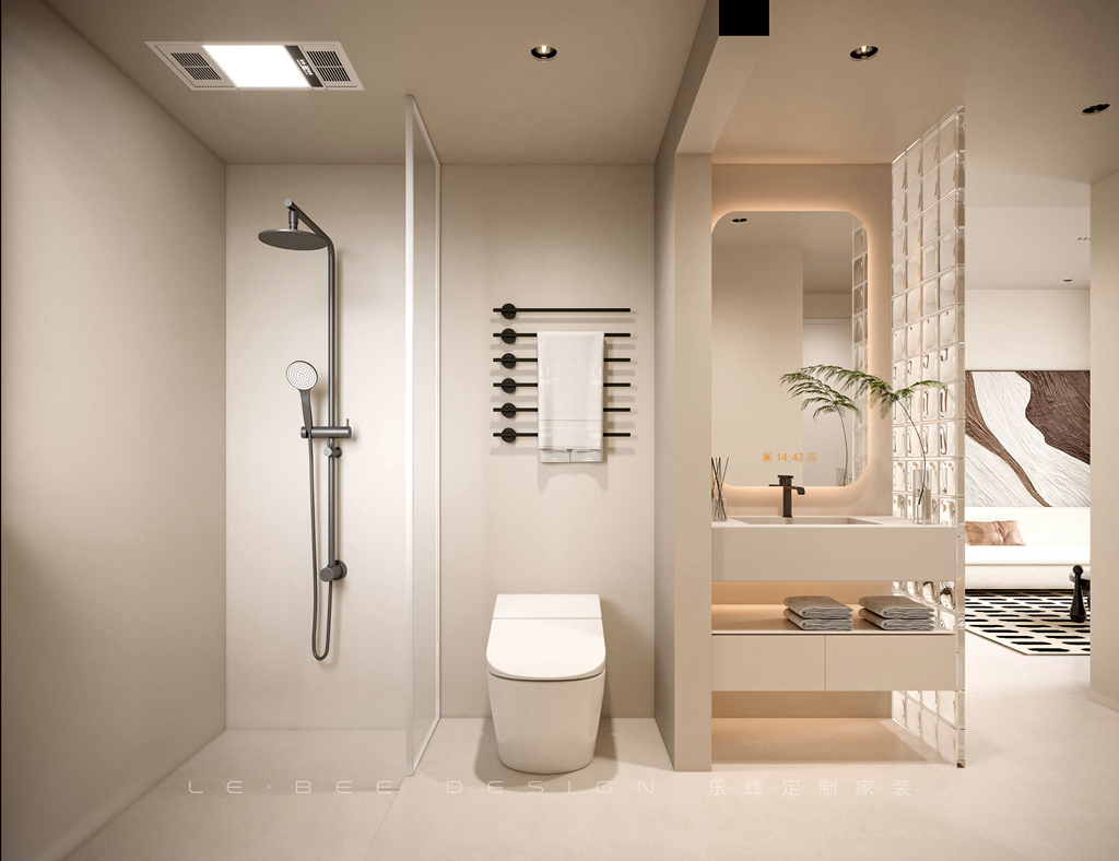 懸空洗漱臺和綠植的點綴,將整個空間裝點得清新自然。鏡面暖光燈照亮著次衛(wèi)的每一個角落,提供舒適的洗滌體驗。