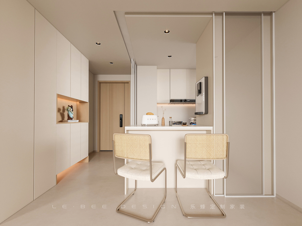 小吧臺既可以用作餐桌,又可以作為交流與溝通的場所。藤編椅子柔軟的奶白色坐墊,提供舒適的用餐體驗。