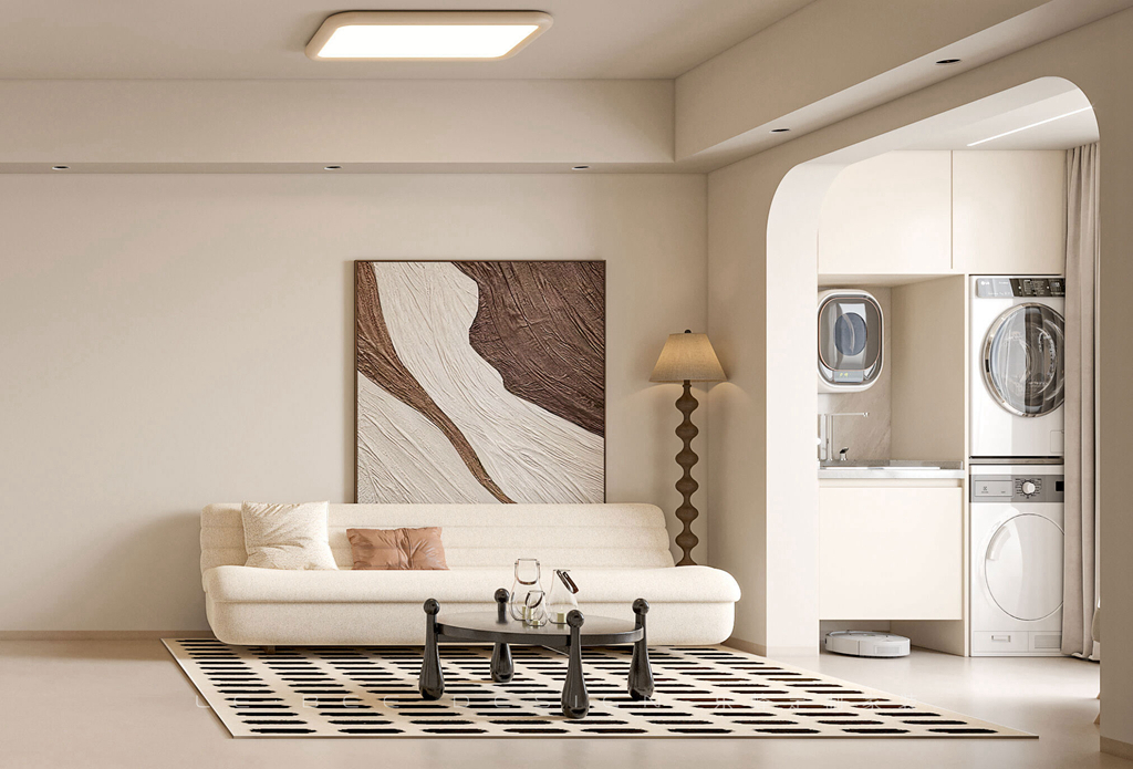 沙發(fā)背景掛著一幅精美的白色掛畫,將空間裝點得生動而雅致。奶白色的沙發(fā)將整個裝修與柔軟、溫馨相結合,而沙發(fā)旁的暖光落地燈為房間增添了一絲靈動。