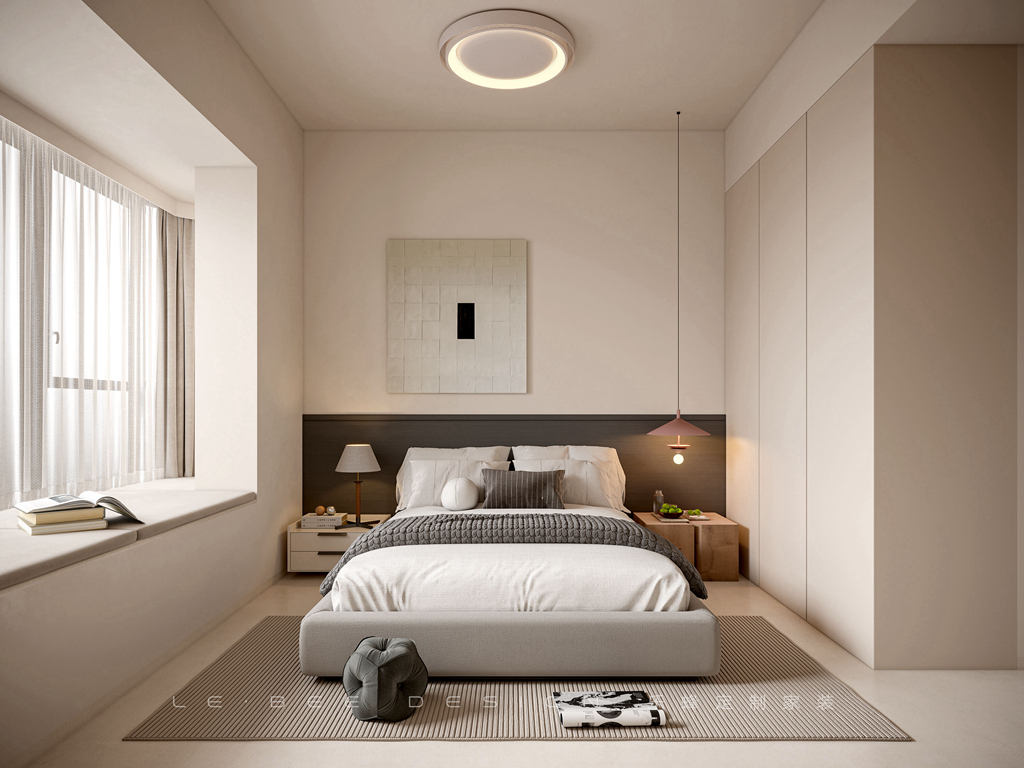 主臥室是整個裝修風格的重要節(jié)點。主燈散發(fā)著溫暖的光芒,使整個房間充滿柔和的氛圍。