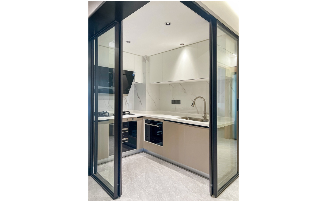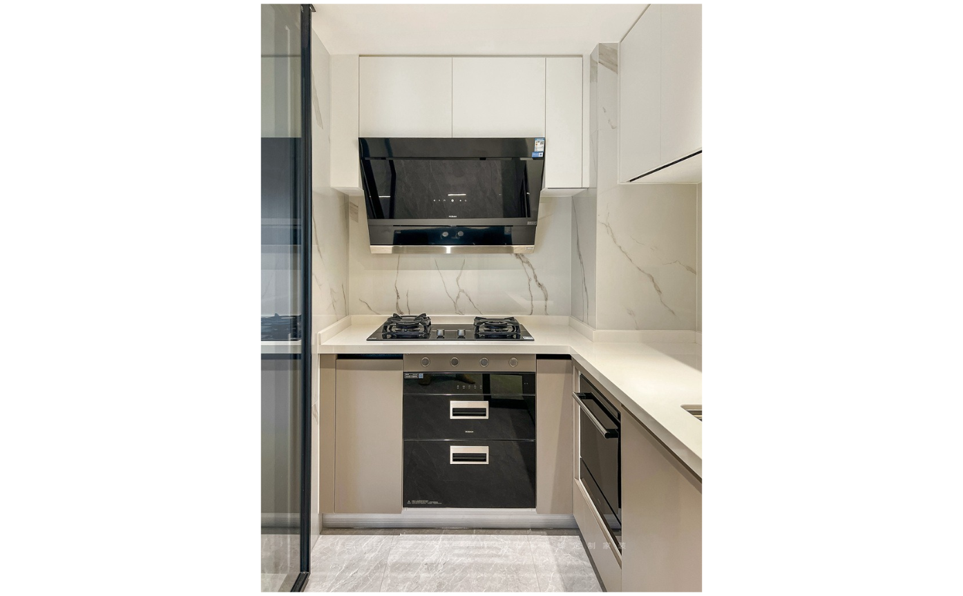 廚房部分,根據(jù)空間的限制,設計師采用了開放式L形廚房的設計,同時利用黑寬玻璃推門,讓廚房與其他區(qū)域相隔。