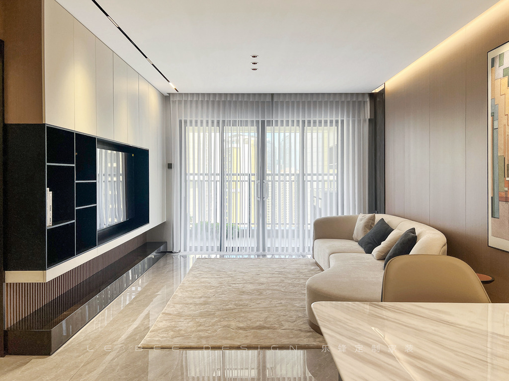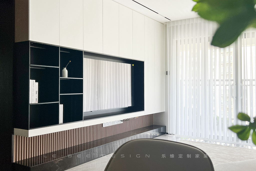 客廳部分,入戶沒有玄關(guān)設計,簡單而實用,設計師在此處設置了一個隱形門,進去就是一個小小的儲物間,便于儲物。地板采用亮面暖光的磚瓷,貫穿整個客廳,通過一組夢幻簾和推窗將陽臺和客廳隔開,讓人可以在陽臺上享受陽光的沐浴,也可以在溫馨的室內(nèi)休息。電視墻柜的黑白搭配讓視覺更豐富,電視嵌入其中,與黑色的大理石電視地臺相得益彰,中間的木欄柵為整個空間增添了一抹美感。