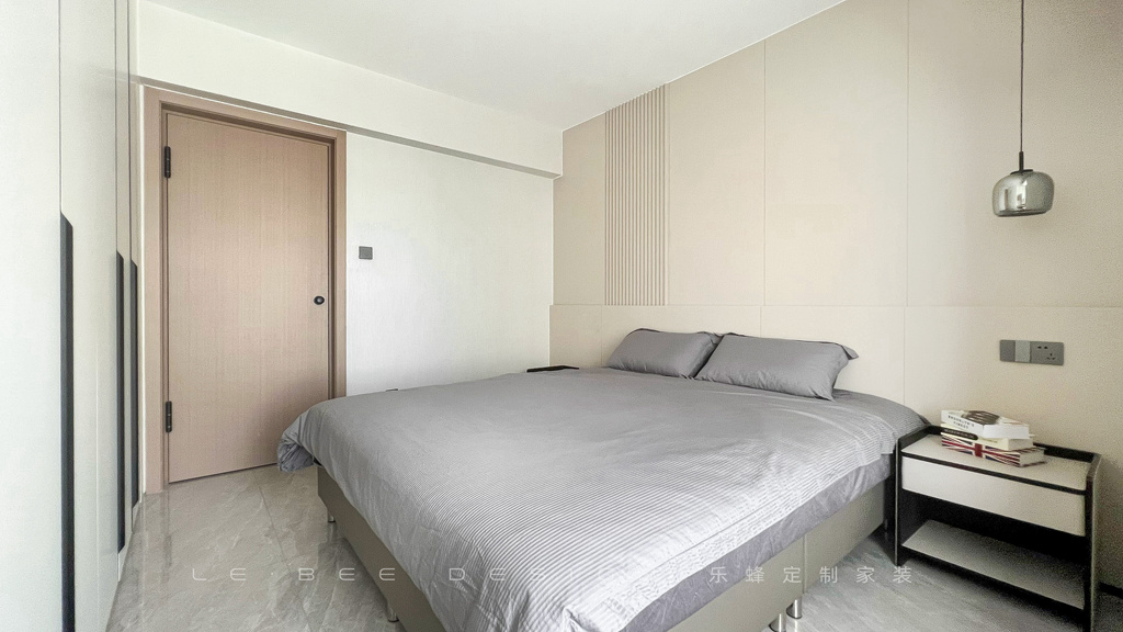 杏色的護墻板、格柵和床頭硬包為空間增添了層次感,床長1.8×2.15米,既溫馨又舒適。黑白相間的床頭柜簡潔而高級,配上床頭的暖光吊燈,為臥室營造出更濃厚的氛圍。床尾設置了一大排衣柜和懸空式的梳妝桌,既滿足了業(yè)主的儲物需求,又可用于日?;瘖y或辦公。