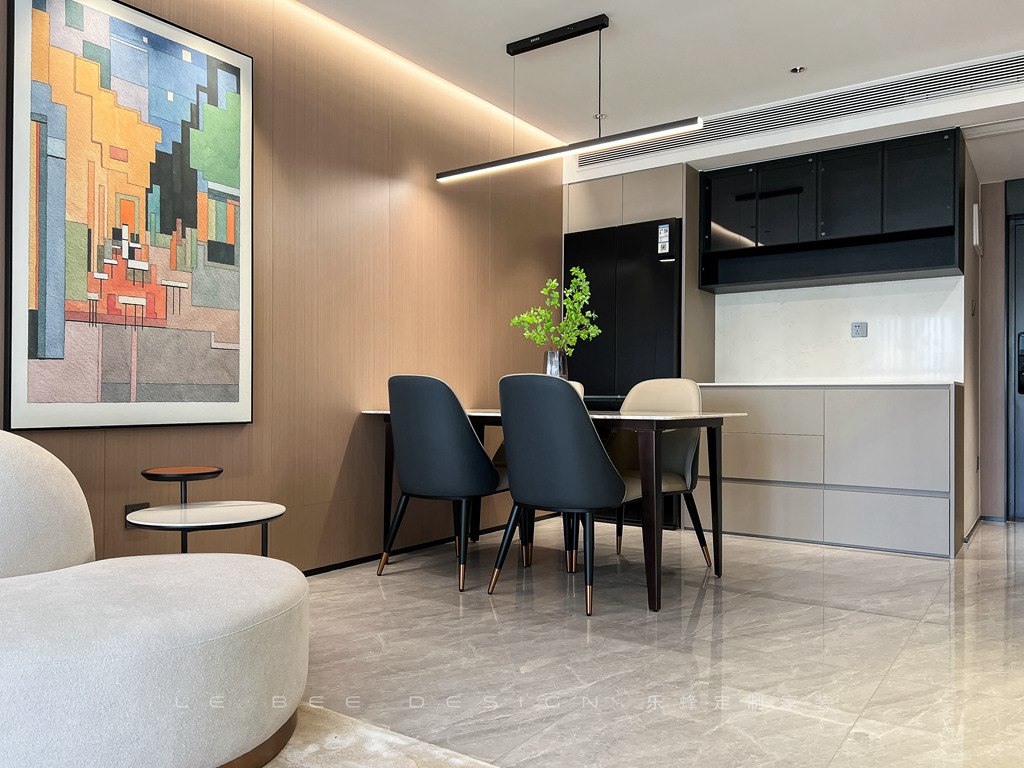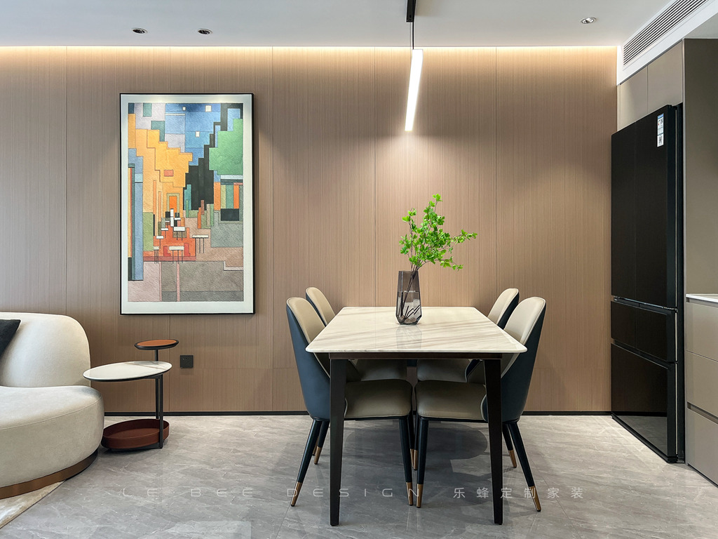 餐廳部分,簡約而高級,大理石餐桌與藍色皮質(zhì)軟座的餐椅使就餐更加舒適自然。長款餐桌搭配長線吊燈,燈光照在綠植上,使整個空間充滿了生機勃勃的感覺。淺灰色與黑色相搭配的餐邊柜,既高級又不失靈動感,黑色的冰箱嵌入其中,黑色的高柜可用來放置紅酒或裝飾品,增加了空間的神秘感。
