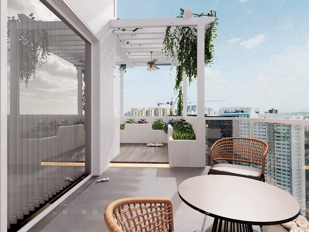 女業(yè)主可以坐在竹編椅子上,喝杯飲品,看著書,為小花小草們澆澆水。站在陽臺上眺望遠(yuǎn)方的城市,心曠神怡。