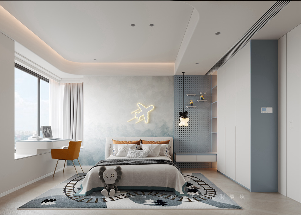 房間整體以淡藍(lán)色為主題,有天空、飛機(jī)和星星的裝飾背景墻,男孩還可以自行擺放他喜歡的手辦和玩具。