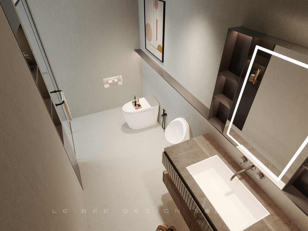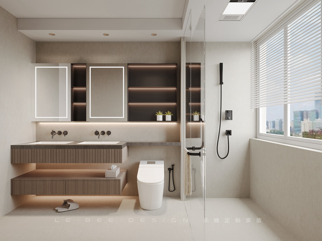 懸空柜的設(shè)計方便衛(wèi)生打掃,干濕分離的淋浴區(qū)則更加簡約。