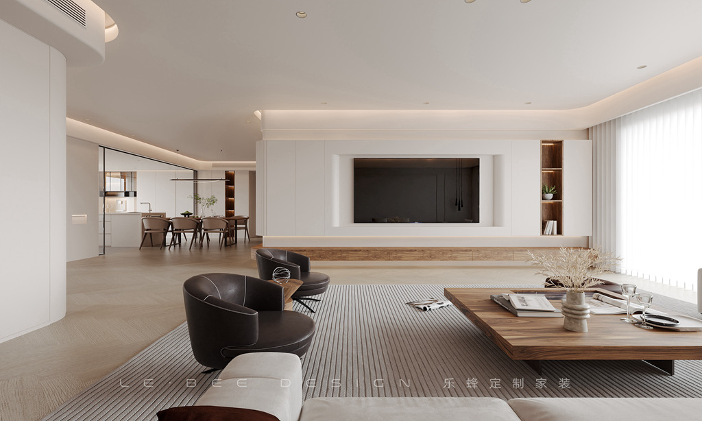 在餐廳可隱約遠(yuǎn)觀客廳區(qū),延伸的電視墻和原木懸空柜為餐廳空間形成裝飾都畫面美化空間。與家人一起在開放式的廚房烹飪好可口的飯菜,在原木餐桌椅上熱鬧享受美食和家人帶來的快樂。