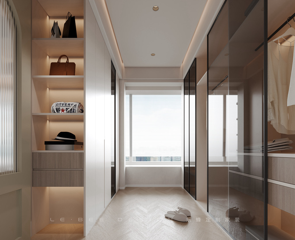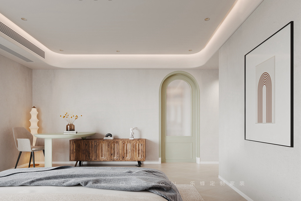 背景墻采用簡約的粗糙感設(shè)計,這邊掛上一幅簡單的裝飾畫。休息區(qū)設(shè)計得非常舒適和安逸,淺灰、暖棕的配色給人一種獨特的舒適感。坐在床尾凳上,可以在這里簡單地看書。而弧形、方形和橢圓形的空間,搭配淡綠色和原木復(fù)古風(fēng)格的元素,非常適合辦公或是看電影。衣帽間被獨立出來,與休息區(qū)分開。半透明門和簡單的柜門保證了隱私的同時,輕松地找到衣物。角落里設(shè)計了女業(yè)主手提包和帽子的專屬存放區(qū)。主衛(wèi)生間與傳統(tǒng)的設(shè)計不同,設(shè)計師設(shè)計了雙洗手盆讓空間更為大氣。