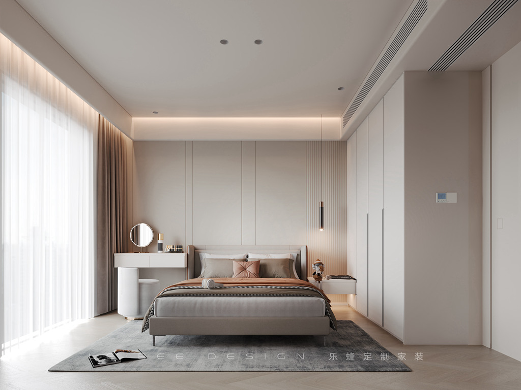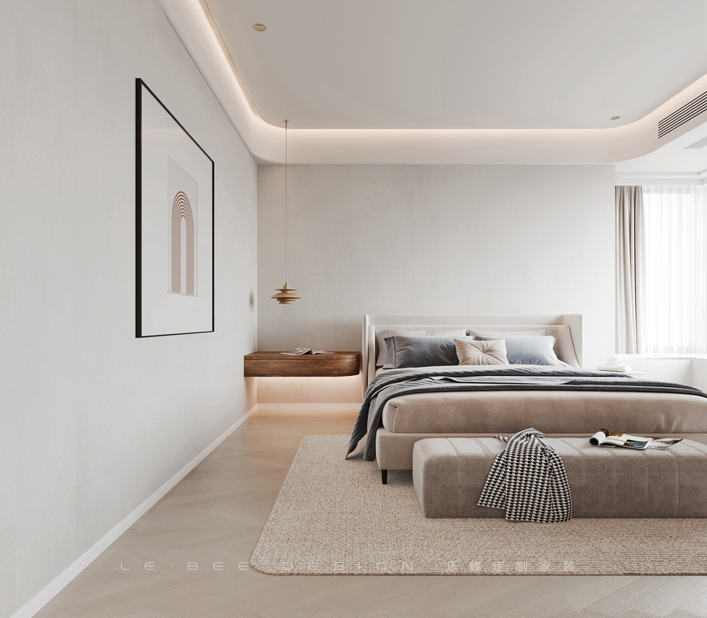 主臥室的燈光設(shè)計和客廳一樣,使用了懸浮頂和線燈、射燈,營造出溫馨的氛圍。床頭的長線吊燈和懸空的原木床頭柜搭配魚骨紋地板,彌漫著復(fù)古的氣息。