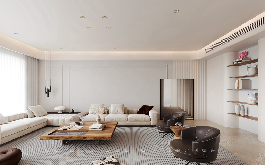 暖白色的沙發(fā)和深咖色的椅子圍成一半,無論是家人還是客人都可以坐下來聊天。簡約的原木茶幾中央,配以灰色的地毯,業(yè)主可以坐在沙發(fā)上看書放松身心。