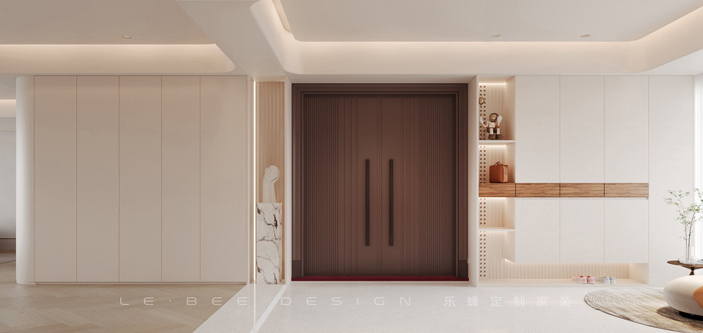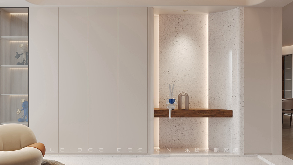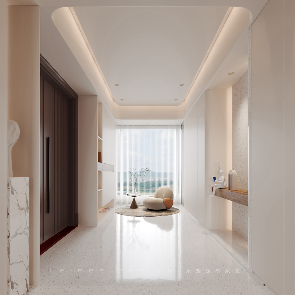 打開入戶門,就會看到大理石、燈帶和原木帶來的高級與大氣感,甚至有一只小白兔靜靜地坐在原木上看書,意境十足。設(shè)計師通過入戶大氣的玄關(guān)將戶外的山景帶入室內(nèi),創(chuàng)造出一幅天然而美妙的畫卷。