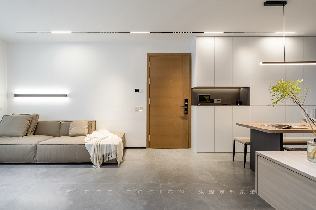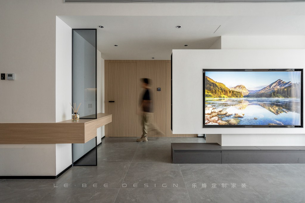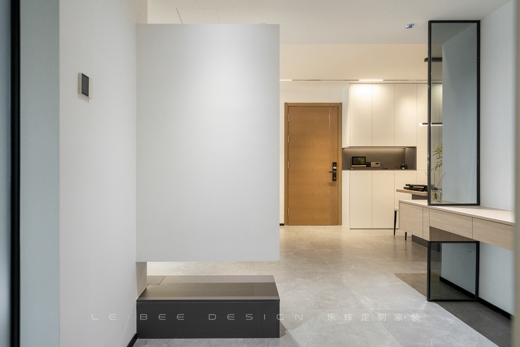 入戶設(shè)計(jì)師為入戶區(qū)設(shè)計(jì)了一道透明黑玻璃屏風(fēng),結(jié)合原木元素,形成跳色效果,讓視覺更舒適,同時(shí)解決了入戶即可見臥室門的尷尬。擺放香薰不僅起到裝飾作用,還營造了獨(dú)特的氛圍。