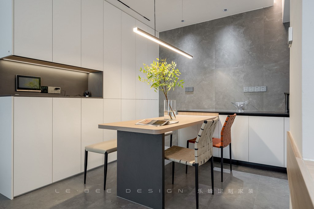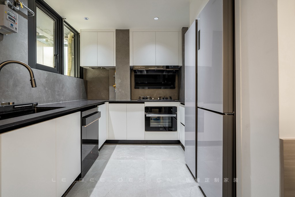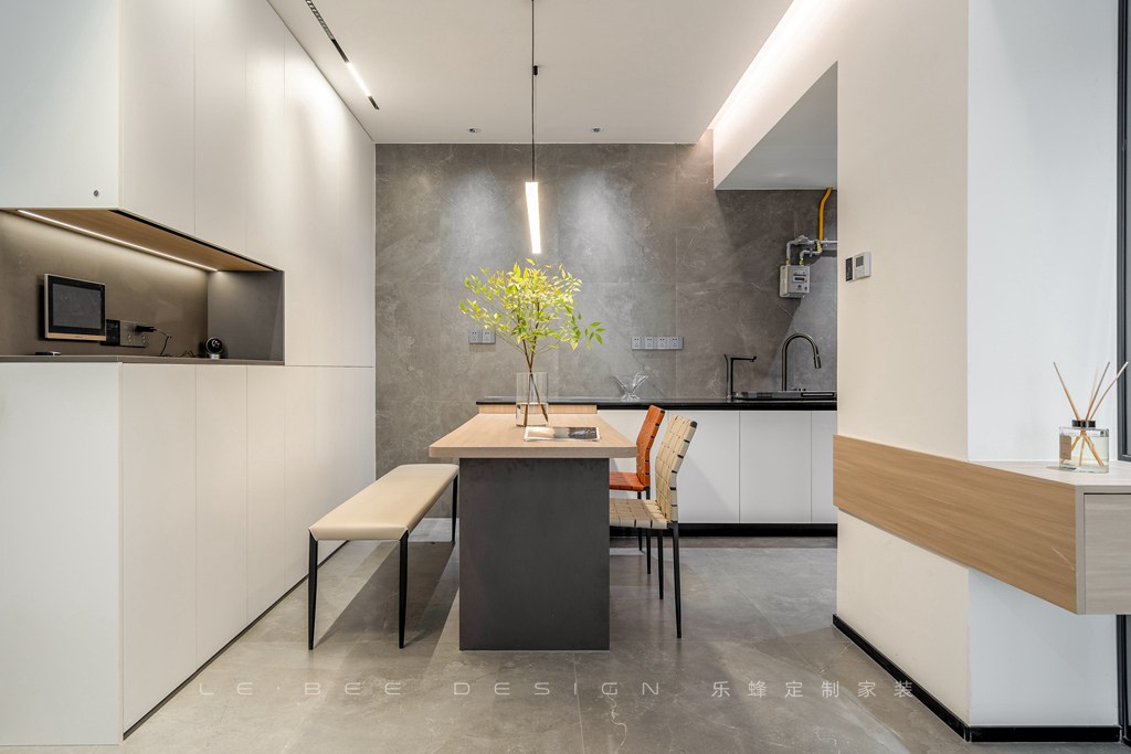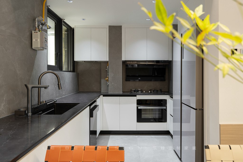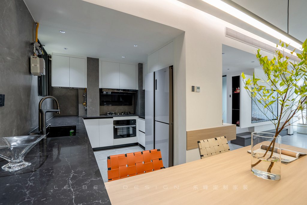 廚房采用黑白灰的色彩,家電嵌入設(shè)計(jì)節(jié)省了空間,充分利用了空間。由于業(yè)主較少在家做飯,所以設(shè)計(jì)師將廚房設(shè)計(jì)成開放式的,與餐廳連接成回字形,收納儲(chǔ)物已足夠。簡單的烹飪也無需擔(dān)心。