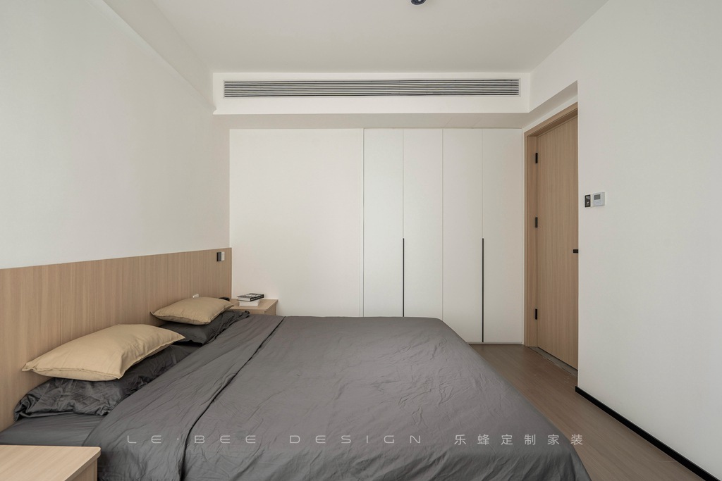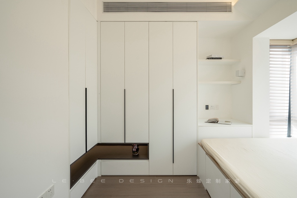 次臥以大量的白色為主,衣柜嵌入Z字形墻體內(nèi),提高了收納空間。