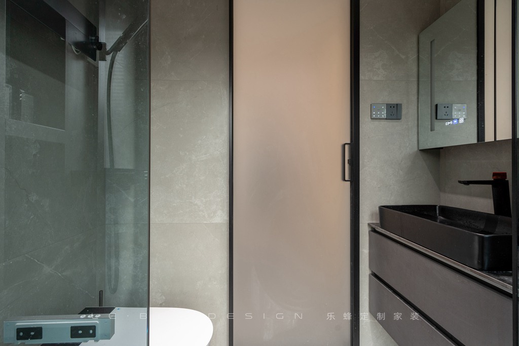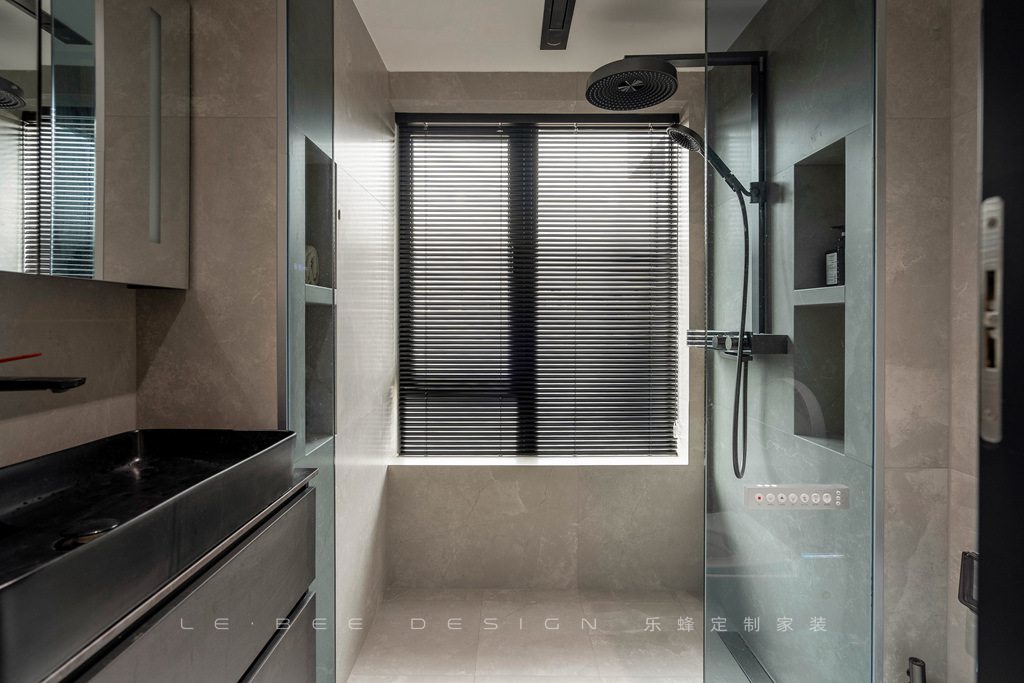 以黑灰色為主,灰色瓷磚搭配黑色百葉窗,既高級又具質(zhì)感。墻上設(shè)置了收納凹槽,方便日常洗漱。