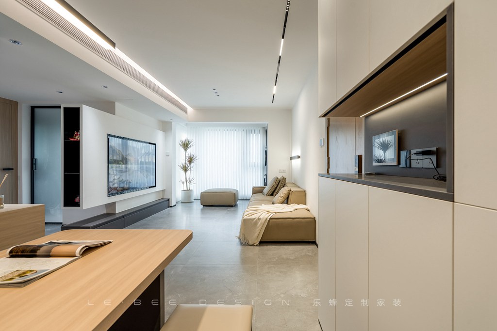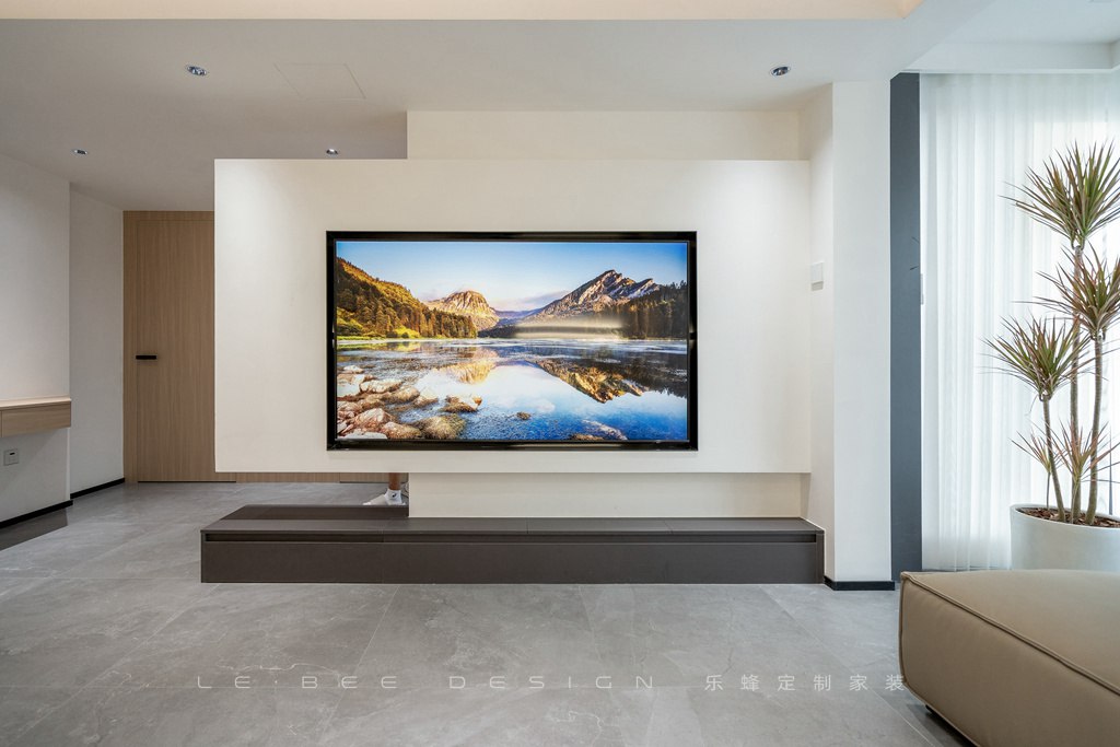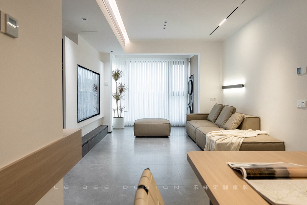 電視墻設(shè)計(jì)師利用承重墻設(shè)計(jì)了一個(gè)懸浮的電視墻,電視嵌入墻內(nèi)更加簡潔,旁邊嵌入的隔板也用來裝飾此處,整體呈現(xiàn)簡約而有質(zhì)感的黑白灰。陽臺(tái)以封窗的形式設(shè)計(jì),使整個(gè)空間感覺更加寬敞。與常規(guī)客廳不同,設(shè)計(jì)師將客廳電視背景設(shè)計(jì)為可調(diào)控的形式,讓整個(gè)空間顯得更加寬敞。卡其色的沙發(fā)展現(xiàn)簡約質(zhì)感美,一張?zhí)鹤狱c(diǎn)綴增添了些許慵懶感。大方塊沙發(fā)與綠植的搭配更加有趣,綠植的融入也增添了生機(jī)。