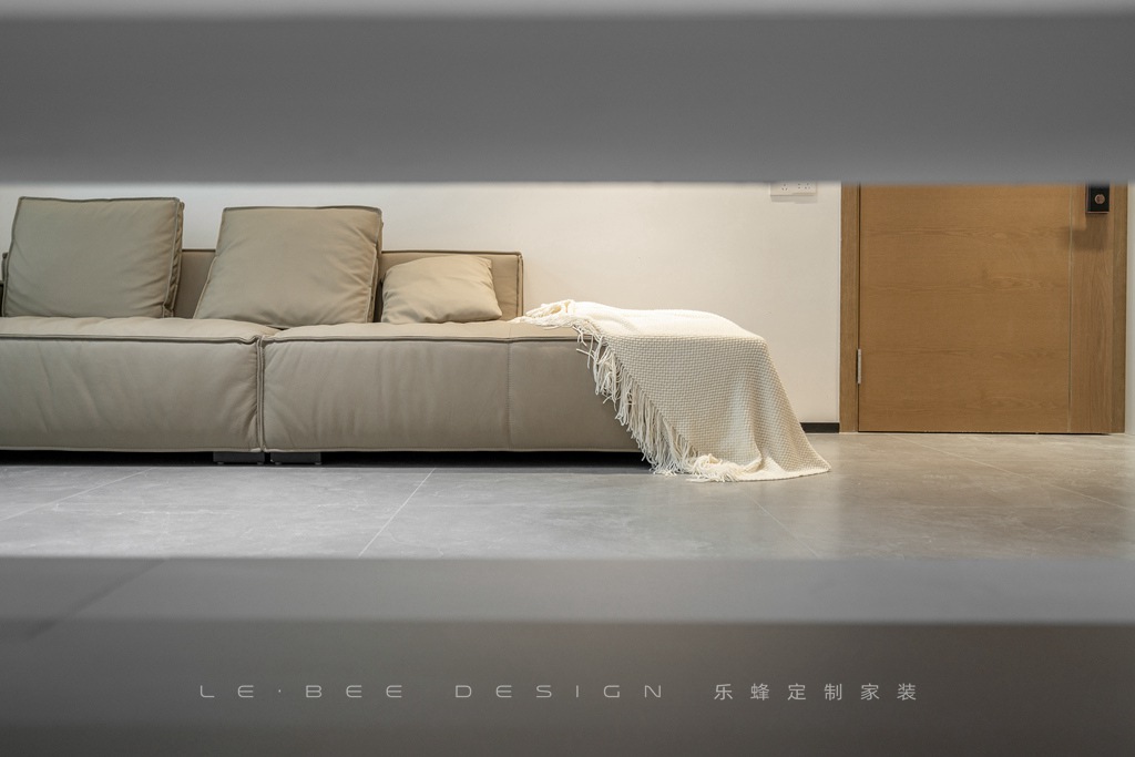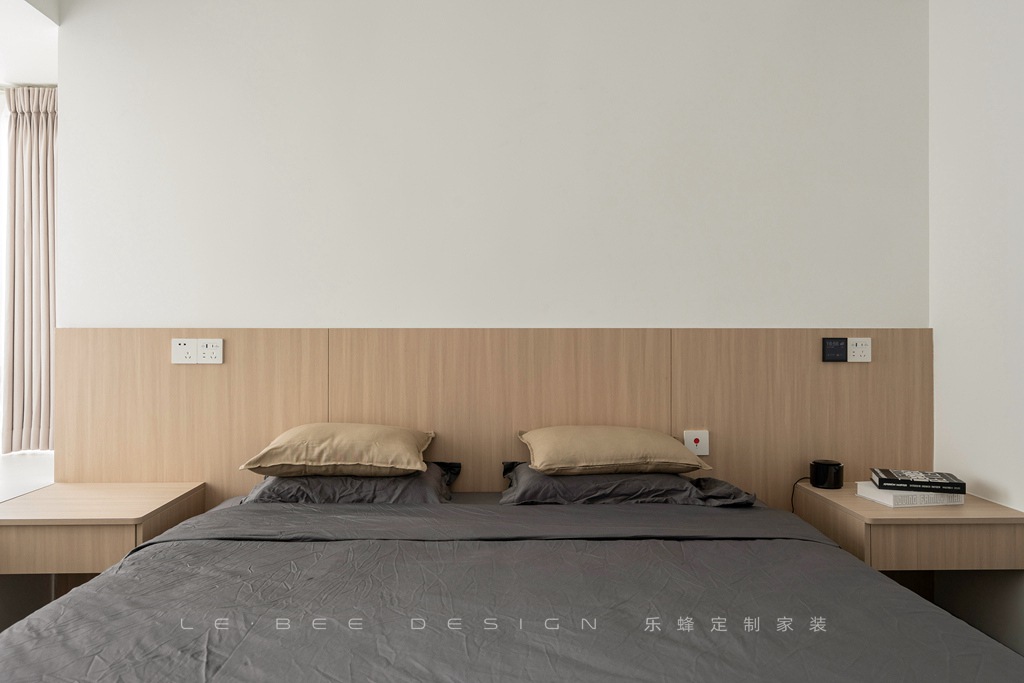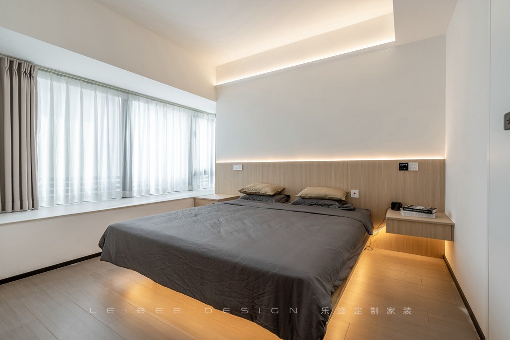 特別的是懸浮窗設(shè)計(jì)采用隱藏式床腿,無論從哪個(gè)角度看,都仿佛懸浮一般,簡約卻高級。床頭的懸空床頭柜帶來了高級感,黑灰色的休息區(qū)更增添了溫馨感。