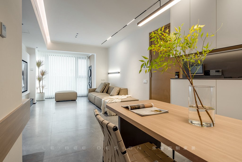 餐廳簡單而攝人心魄,黑灰的瓷磚與桌腳相得益彰。長線吊燈、原木桌子搭配橙色和杏色的餐椅,櫥柜延伸形成餐邊柜,更加便利。一旁的長凳具有多功能,既可用于進(jìn)餐,也可作為更換鞋子的座椅。望去客廳的延伸感極強(qiáng),畫面唯美而簡約。