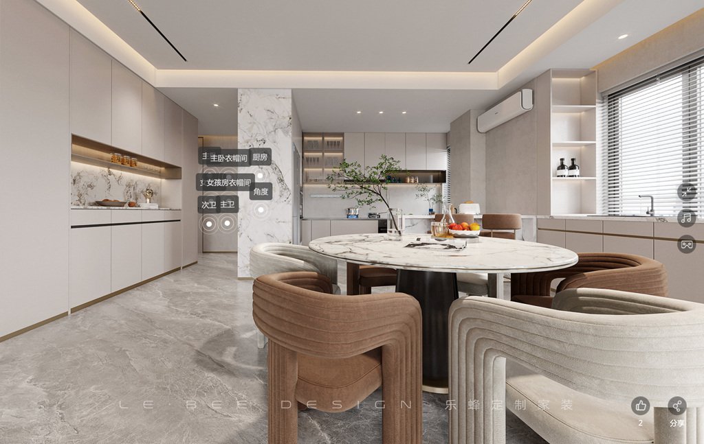餐廳中,巖板餐桌搭配輕奢彩虹餐椅,讓人忍不住向往。