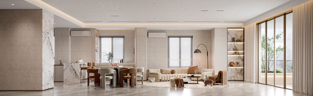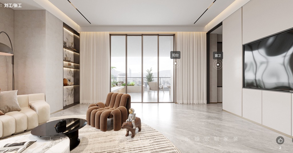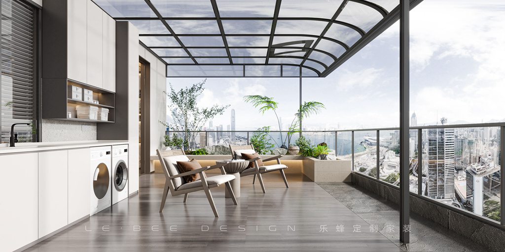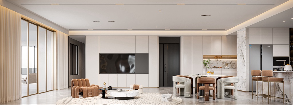 客廳運(yùn)用巖板、暖色調(diào)藝術(shù)漆和質(zhì)感灰色亮面地磚,營(yíng)造出溫馨大氣的氛圍。由于沒(méi)有中央空調(diào),改造后的客廳更加寬敞通透,懸浮頂設(shè)計(jì)也增加了空間感。生活陽(yáng)臺(tái)通過(guò)落地推窗隔開(kāi),明裝式窗簾盒在吊頂平面上,形成了一條遮擋板,使陽(yáng)臺(tái)更加私密。陽(yáng)臺(tái)上養(yǎng)著綠植花草,豐富了日常生活,同時(shí)也設(shè)置了洗衣區(qū)和洗手池,方便日常洗衣和清潔。電視墻一側(cè)的設(shè)計(jì)師特意為業(yè)主設(shè)計(jì)了一些儲(chǔ)物空間,圓弧墻角設(shè)計(jì)低調(diào)而獨(dú)特