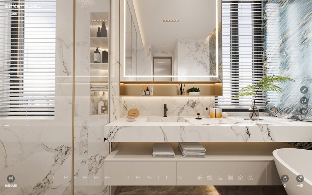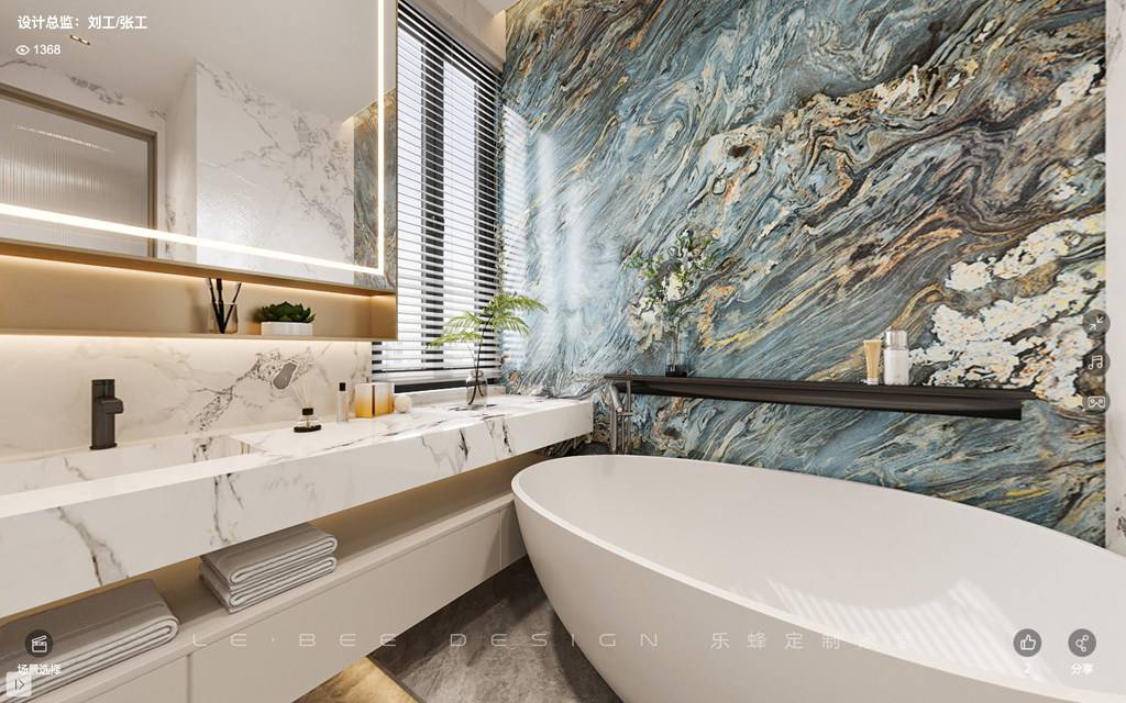 梳妝柜子設(shè)計(jì)在窗邊,女主人可以在這里梳妝打扮,不用擔(dān)心光線問(wèn)題。墻壁上的墻燈進(jìn)一步裝飾了空間。衣帽間旁邊是主衛(wèi),整體色彩統(tǒng)一,采用干濕分離設(shè)計(jì),淋浴處有凹槽放置洗漱用品,非常方便。懸空的洗漱臺(tái)設(shè)計(jì)也更加美觀大氣。浴缸以奢石藍(lán)翡翠巖板作為背景,墻壁上設(shè)計(jì)了黑色置物架,擺放上香薰,營(yíng)造出舒適的沐浴氛圍。