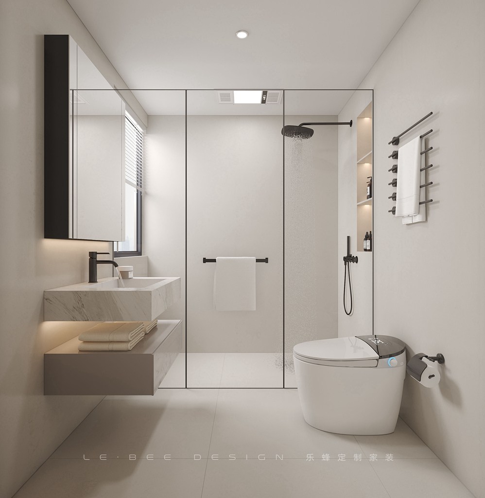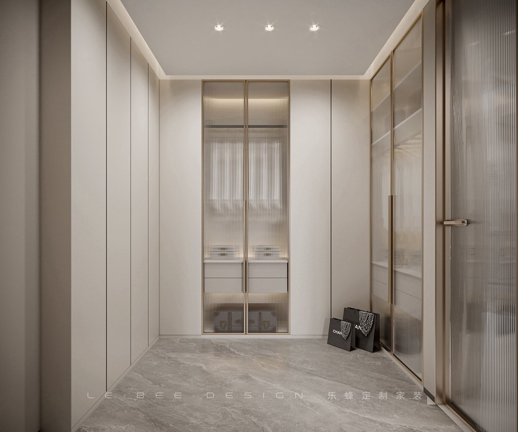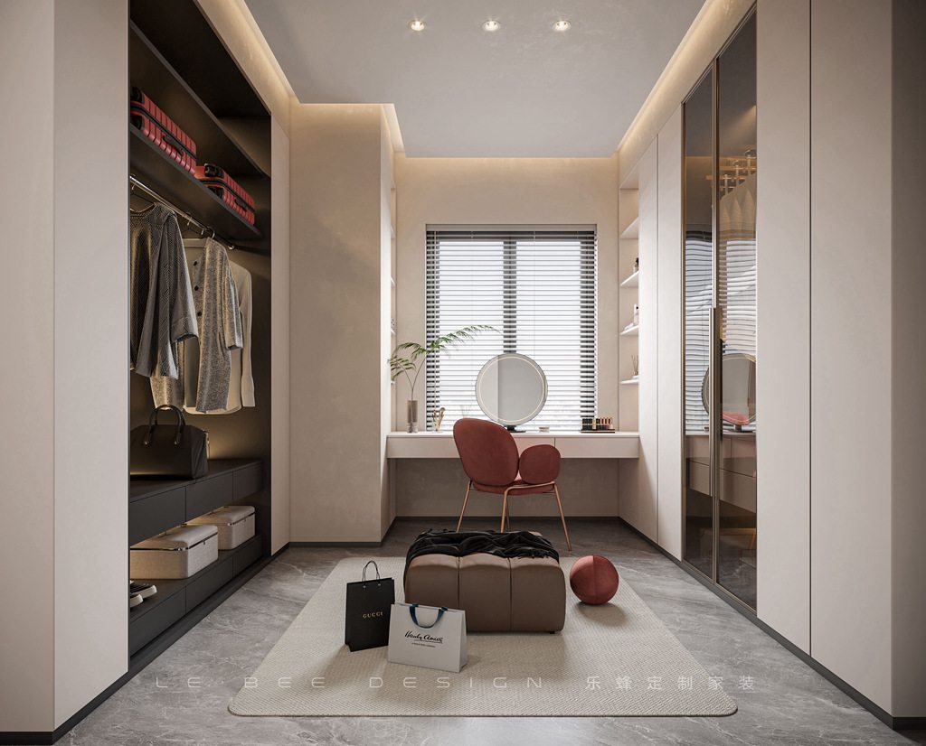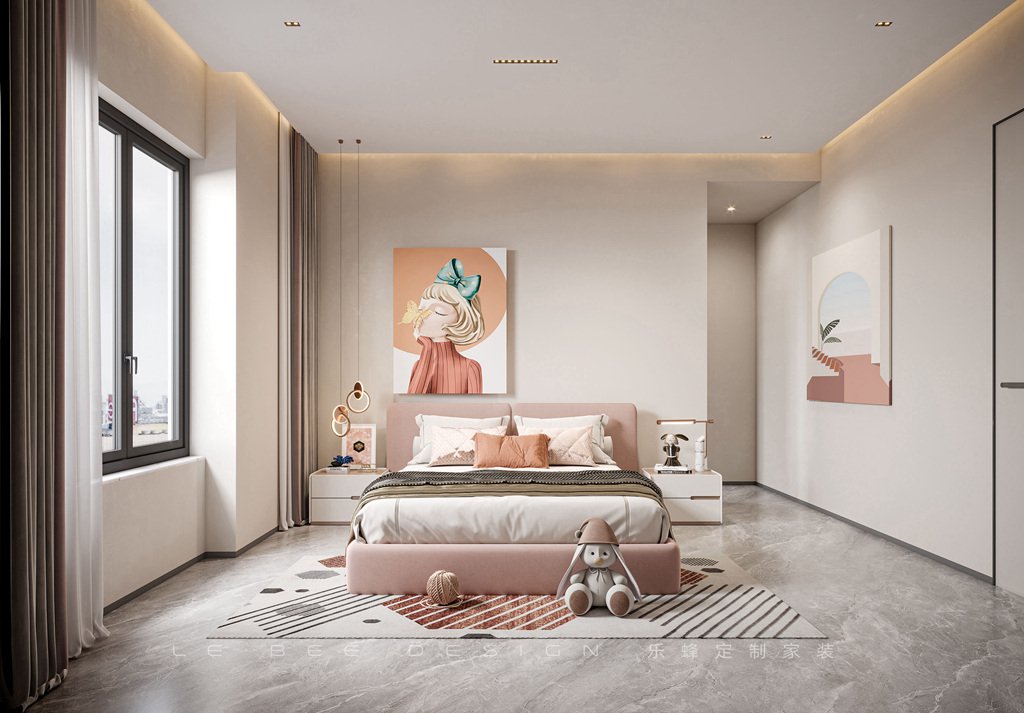 次臥用一點(diǎn)淡淡的粉色裝飾臥室內(nèi),屋內(nèi)有小兔子,女孩輕吻蝴蝶的唯美掛畫(huà)為背景裝飾,床頭燈設(shè)計(jì)兩個(gè)長(zhǎng)線吊燈,烘托溫馨的氛圍。衣帽間百葉窗邊設(shè)計(jì)懸浮梳妝桌搭配紅色的椅子,兩邊是衣帽柜,一邊設(shè)計(jì)開(kāi)放式掛季節(jié)服裝或是放置包包,另一邊存放過(guò)季衣物。次衛(wèi)設(shè)計(jì)師在此處設(shè)計(jì)了弧形鏡面,墻邊嵌入隔板用來(lái)放置洗漱用品,線燈設(shè)計(jì)也照亮了暗處。淋浴區(qū)還設(shè)計(jì)了瓷磚拉槽,排水速度極快。