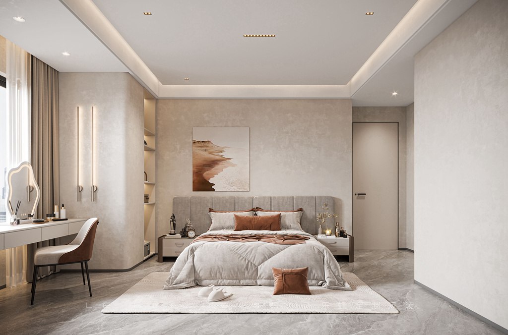 主臥采用懸浮頂設(shè)計(jì),沒(méi)有主燈,休息區(qū)的軟包設(shè)計(jì),一幅掛畫(huà)作為背景,側(cè)面墻設(shè)計(jì)凹槽隔板用于裝飾或者儲(chǔ)物,弱化了承重墻,使臥室更加豐富多樣。