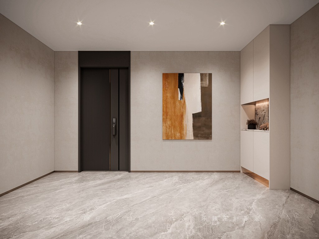 玄關(guān)空間寬敞明亮,入戶門(mén)設(shè)計(jì)成沉穩(wěn)大氣的黑色格柵。墻面則運(yùn)用掛畫(huà)來(lái)進(jìn)行裝飾,使鞋帽柜更方便換鞋。巖板背景和臺(tái)面增添了設(shè)計(jì)感,并使空間更富有層次感。