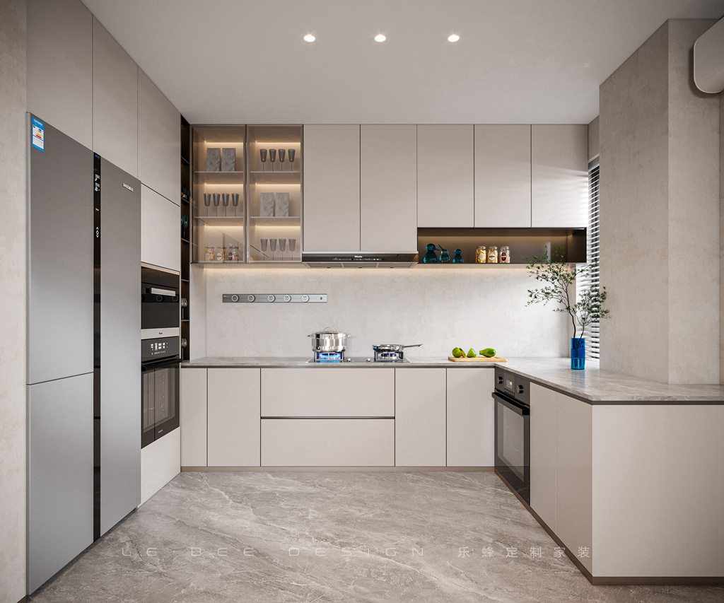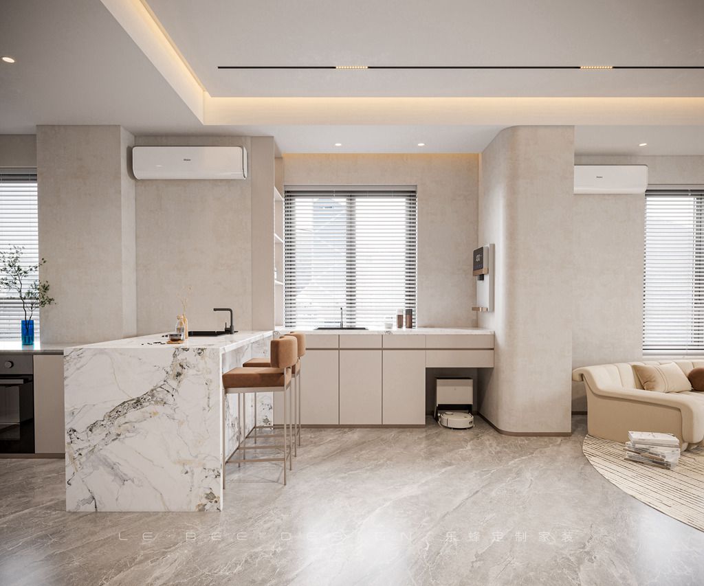 開(kāi)放式的廚房采用回形設(shè)計(jì),與客廳地板磚相連,高低柜提供了豐富的儲(chǔ)物空間,電器嵌入式放置,整齊干凈。烹飪區(qū)還設(shè)計(jì)了軌道插座,解決了預(yù)留插座少、線短鏈不上的問(wèn)題。巧妙地利用廚房右側(cè)的空間設(shè)計(jì)了巖板吧臺(tái),搭配高腳椅子,可以坐在這里喝茶或者閱讀。