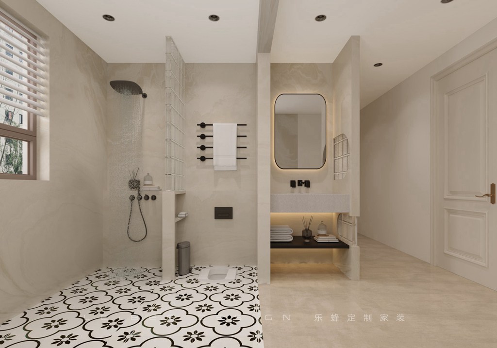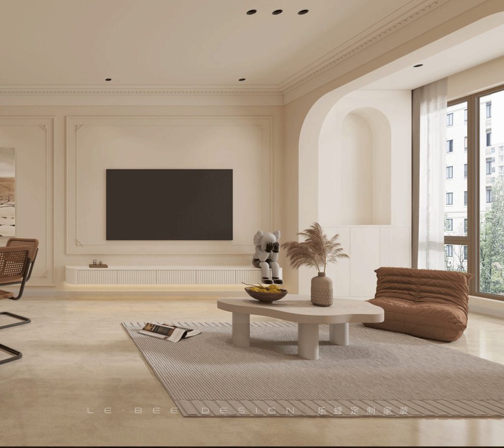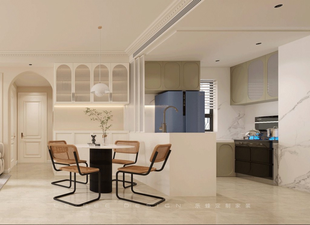 本案業(yè)主是一對小年輕,時尚潮流,比較容易接納新的事物和需求。所以設計主題為:美式簡約奶油風格。設計亮點:整體色調溫馨,采用不用材質和弧形線條設計,運用玻璃磚,半開放式廚房,還有背景墻的美式線條,讓空間更加立體、突出,增加空間的層次感。
